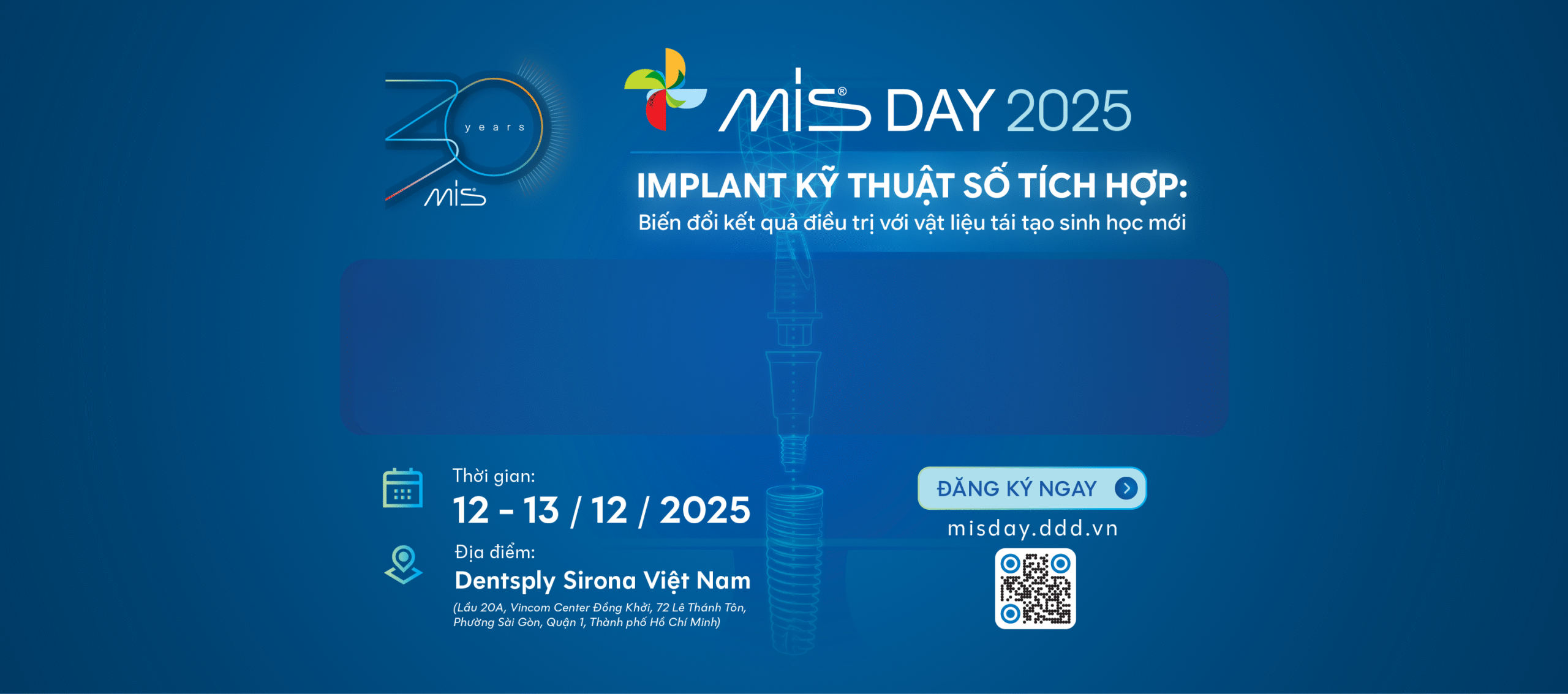 MIS DAY 2025 mang đến chương trình đào tạo chuyên sâu về Implant kỹ thuật số tích hợp và vật liệu tái tạo sinh học mới. Chương trình tập trung vào hệ sinh thái kỹ thuật số, quy trình lấy dấu truyền thống, workflow phục hình từ đơn lẻ đến toàn hàm và phẫu thuật đặt implant bằng máng hướng dẫn. Với sự hướng dẫn của BS. Orawan Kulklang và phiên dịch ThS. Vũ Đức Hiếu, học viên sẽ nhận được kiến thức hệ thống, kỹ năng thực hành thiết thực và giải pháp tái tạo tiên tiến giúp nâng cao hiệu quả điều trị implant. Đăng ký ngay MIS DAY 2025 để trải nghiệm một buổi học thật thú vị và nhiều giá trị học thuật.